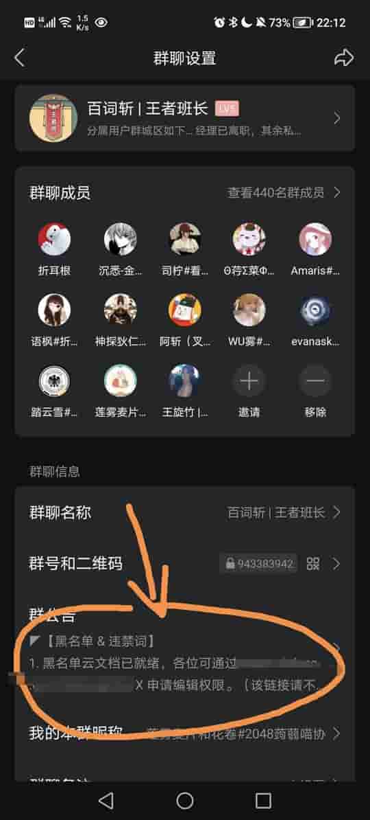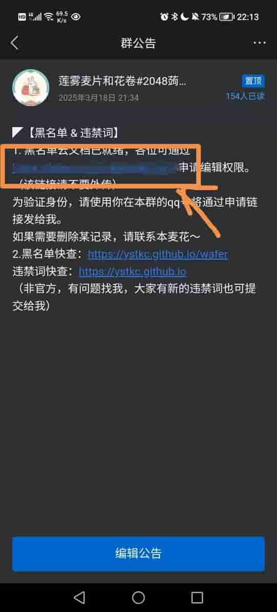 3️⃣ 找到关于王者黑名单的群公告,点击其中的文档编辑权限申请链接